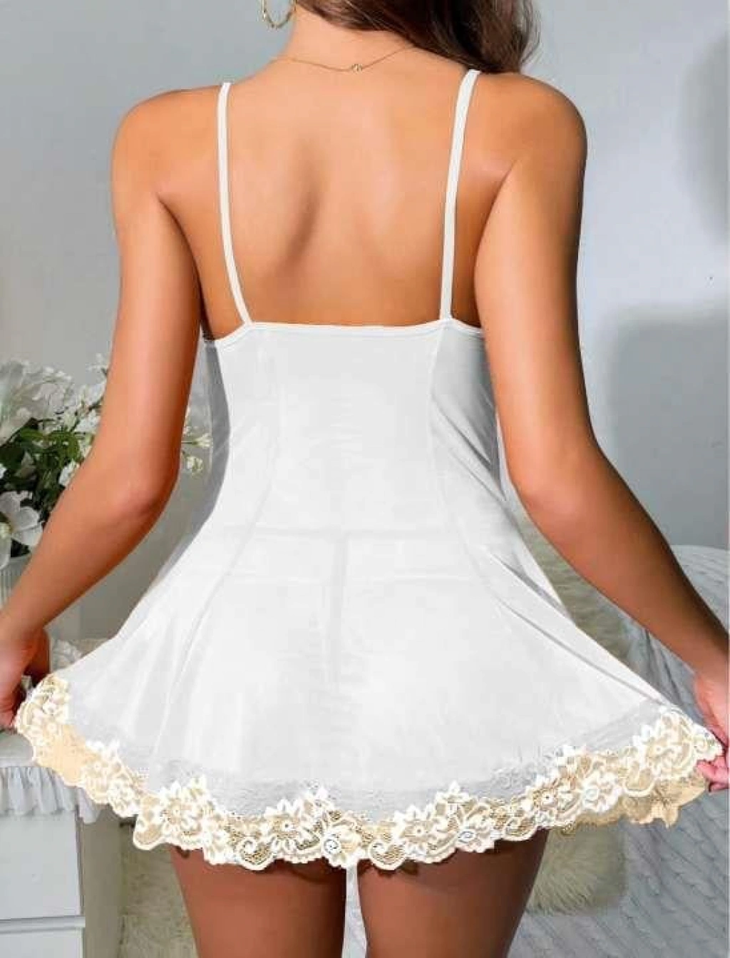 ? Zarafet ve Rahatlığın Mükemmel Uyumu! Beyaz Dantel İşlemeli İnce Askılı Likralı Fantezi Tül Gecelik, esnek likralı kumaşı sayesinde vücudu nazikçe sarar ve konforlu bir kullanım sunar. Hafif tül kumaşı ve zarif dantel detaylarıyla romantik ve feminen bir görünüm sağlar.