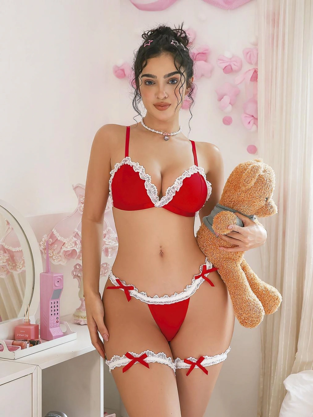❤️ Boyunluklu Bacak Aksesuarlı Kırmızı Fantezi Hizmetçi Kostümü ❤️
