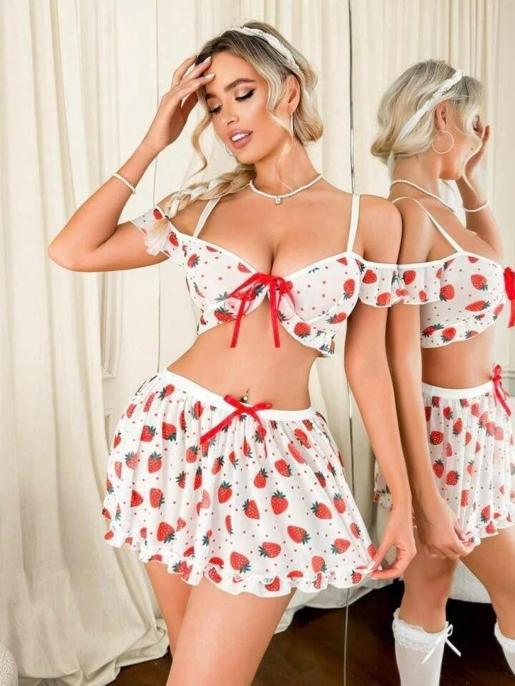 Arias Closet Beyaz Çilek Desenli Etekli Fantezi Sütyen Takım