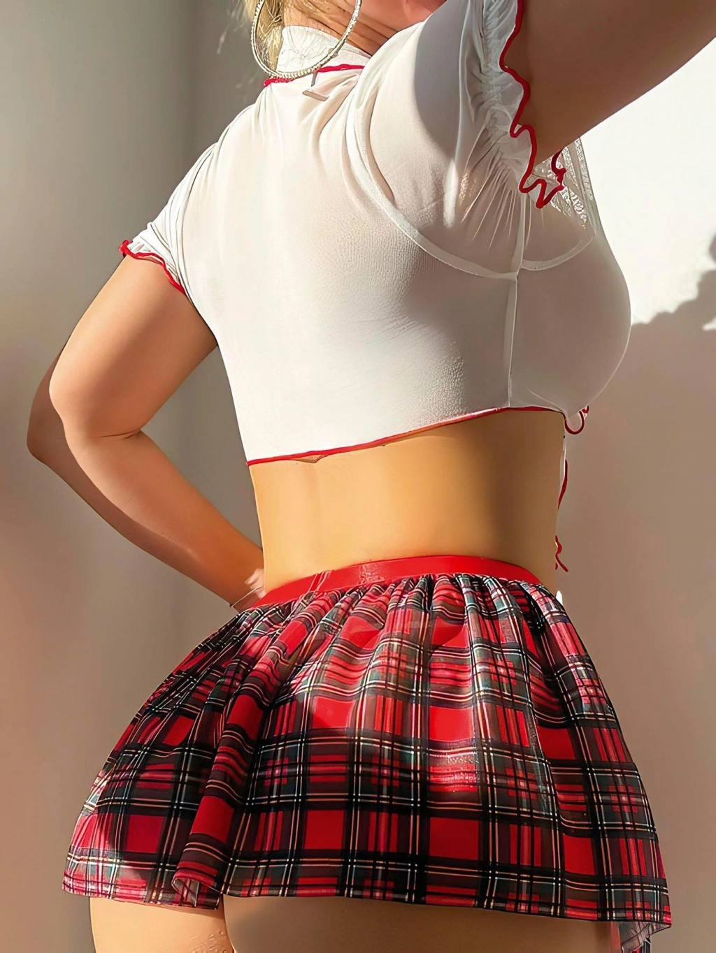 ? Şık Tasarım Tül Ekose Etekli Üst Kısmı Bağlamalı Fantezi Öğrenci Kostümü ?